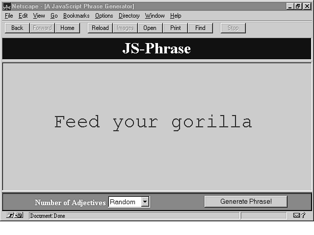 You can specify either a variable or a function name on the right side of the colon in a javascript: URL. Normally, you use a variable to return an unchanging (or static) value, whereas you use a function to return dynamic content. If a variable name refers to an object, however, and that object has a toString() method defined, the function associated with the toString() method is called when the object is referenced in a javascript: URL, in which case dynamic content may be returned. You see an example of this behavior in the later section entitled "A Random Phrase Generator."