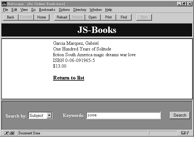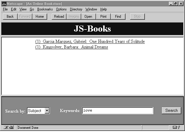 Clicking the Search button calls the doSearch() function. This function examines the selection list and performs the appropriate search. The result list is placed in a global variable called results. The doSearch() function then loads the show frame with a javascript: URL that calls showList().