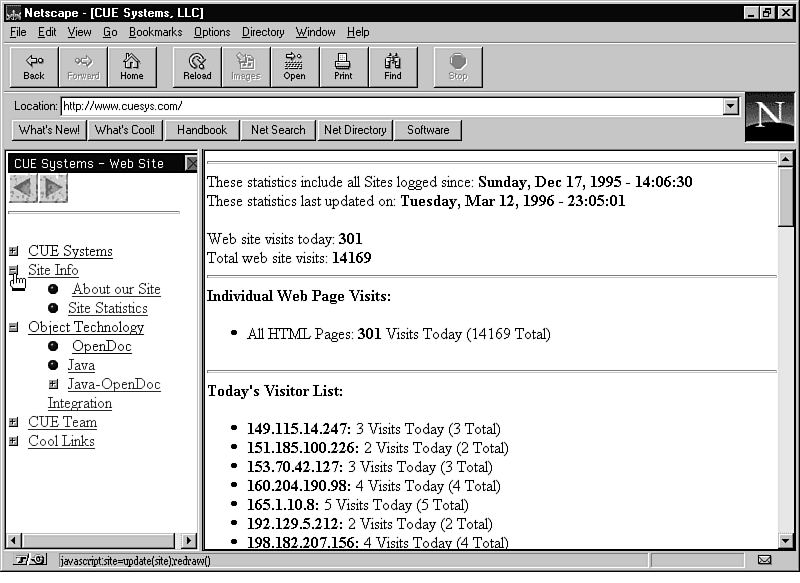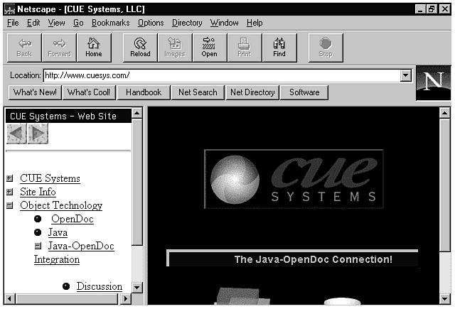 When developing Cue Systems' public Web site, he wanted to use an outline model to relay navigational information to the user. His plan was for an application to automatically track the pages and links and assemble the outline based on that information. Each time a user accessed his site, the server would search for folders and documents-using the information to build an outline, which in turn would be used as a hot-linked table of contents.