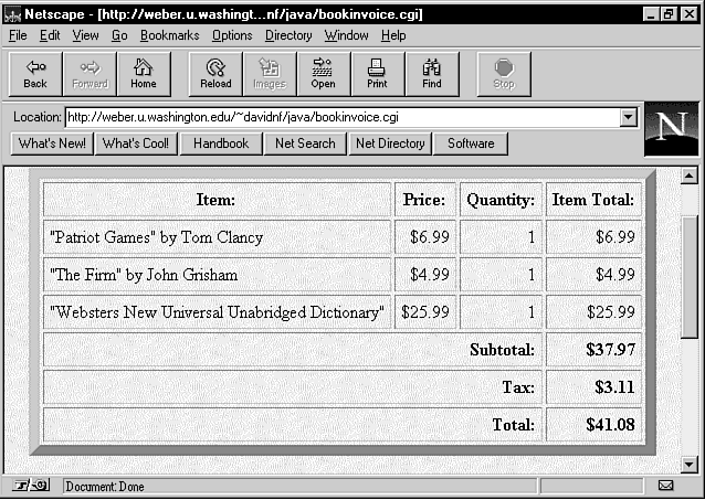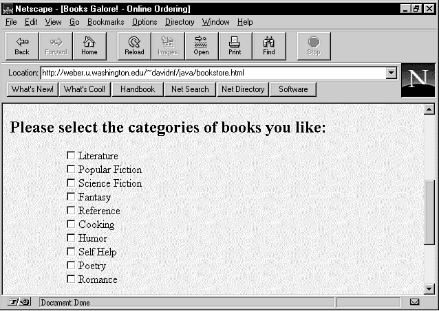 "The page is pretty standardized," Nagy-Farkas says. "The user submits a choice for book categories, and the CGI script returns with a brand new page." With the JavaScript functions in place, it becomes a matter of getting the right information into the document.
