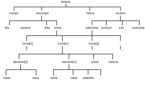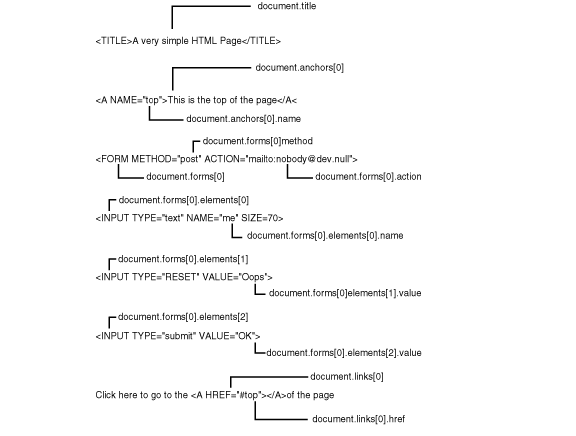 The important aspect of this example is not its primitive HTML, but the fact that the HTML elements in it are reflected in the JavaScript object hierarchy. We have already seen that we can access the title of this document through the title property of the document object. We can also access the other HTML elements of this document using the following properties: