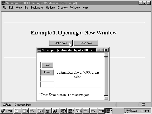 Finally, it is worth pointing out the utility of having the child window's Close button in the parent window, especially if the child window is small. The open() method will not create a second window of the same name, although it can do some updating if you make a second open() call with different parameters. If you click the Make Note button and nothing happens, it is possible that you did not get rid of the last window you made.