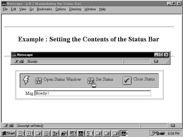 This might seem like a significant restriction. By rewriting the document, however, you can change the contents of a window. This technique enables you to change the values of form elements, the content of the status bar, the position of the pointer in the history list, and the location (the URL that the window contains) at any time. Table 8.1 lists these various elements, when they can be modified, and how they can be modified. Note that the last two items in this table are not really window elements; they control what is displayed, but are not explicitly displayed themselves.