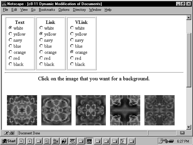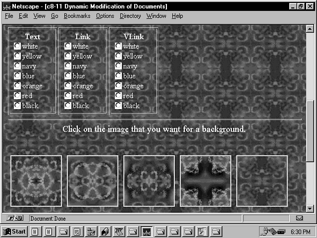 Figure 8.4 shows the result of loading this page (only the top part of the page is shown). The page starts out in the default Netscape colors. It gives the user the opportunity to select text and link colors, and a background tile. The user is in the process of selecting a tile.