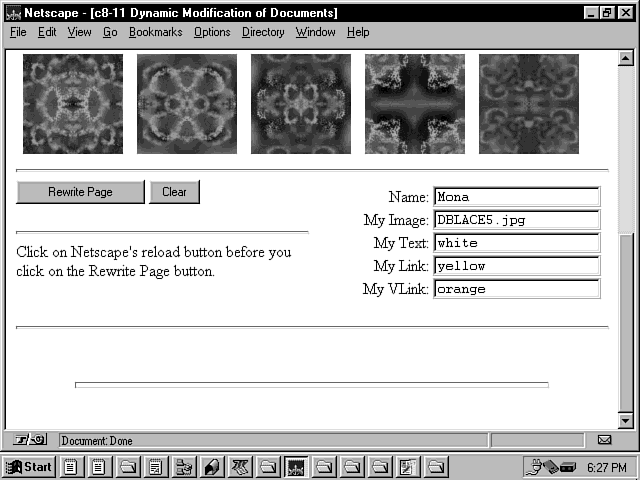 Figure 8.5 shows all the choices being placed in the summary form as the user clicks and enters text. Figure 8.6 shows the browser window after it has been rewritten dynamically to use the colors and tiles chosen by the user. Note that the summary form's contents have been added to the command line.