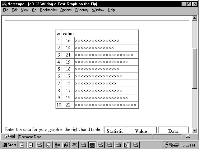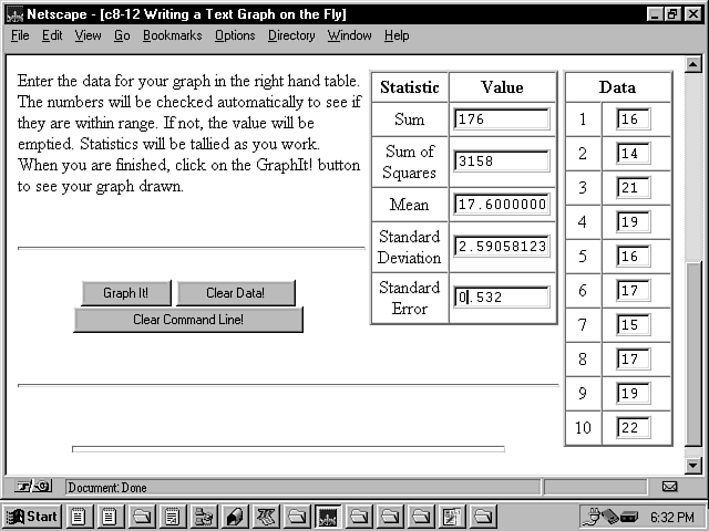 As the user enters data, it is checked to see whether it falls within an acceptable range. As this is done, cumulative statistics are also kept. These are presented in a table adjacent to the data itself. Finally, if the location is reset, then all the fields in the form are cleared. This approach is much more polite than using Netscape's Reload button. Note that a footer script is used to reload the data fields. Figure 8.8 shows the result after user input has been entered and a graph drawn.