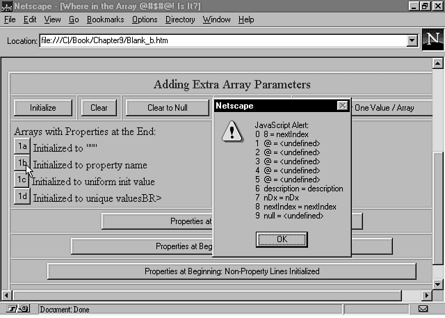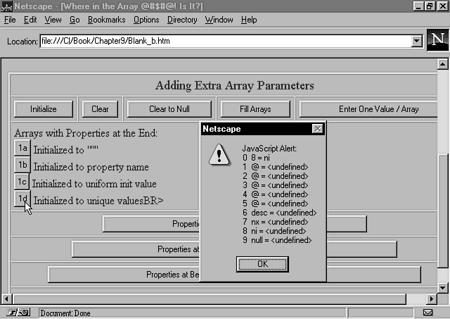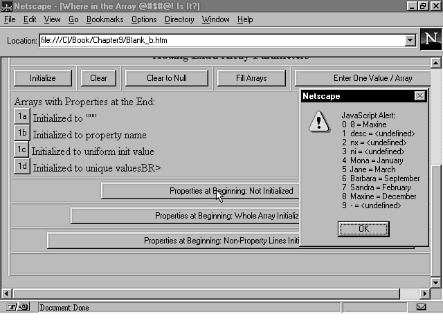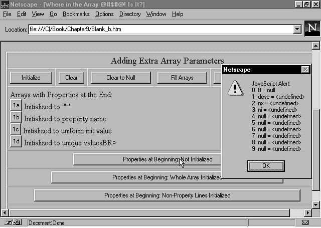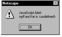Figure 9.1 illustrates this idea. When the first button is pressed, an alert dialog box results, which tells you that there is an undefined variable. Since the variable was declared with var inside a function, it is local and "out of scope" to anything outside the function. The other three buttons all access global variables which have been defined outside of a function or within a function without the use of var. Pressing these buttons gives you the value of the variable. The source code for this example can be found in c9-2.htm on the CD-ROM.