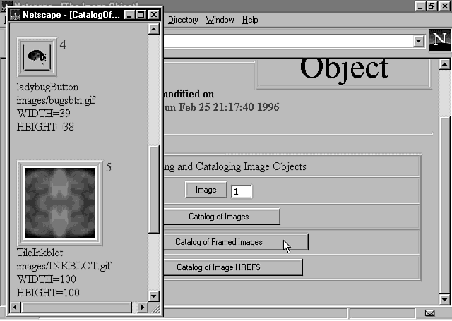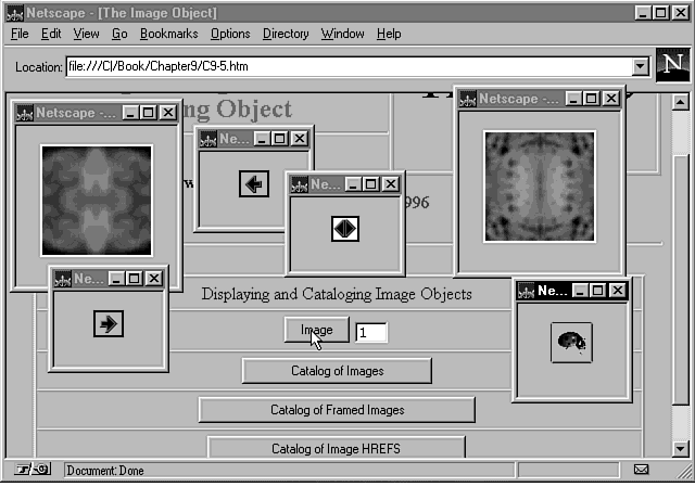 The resulting image display is shown in figure 9.13. The page generated by the CD-ROM file c9-5.htm is covered with pop-up windows containing its tiny database of six images. The images were placed in the pages arbitrarily; the page has no input interface. Any single image can be popped up by placing its number in the text box next to the Image button and clicking the button. Figures 9.14 and 9.15 show the plain and framed versions of the image displayed in a catalog format. The image catalog is nothing more than a scrolling display of all the images in the database.