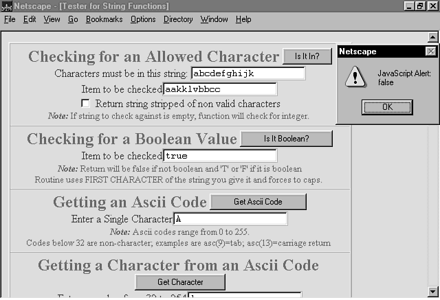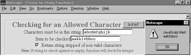 The first portion of the isIn( ) function makes sure that astr and nstr are both strings, and initializes nstr to its default value if it was given as the empty string. It also ensures that strip is boolean (the function isBoolean( ) is described in the later section "Boolean Validation"). The for loop then examines every character in astr. The substring function extracts each character into the local variable cc and checks to see if that character may be found in nstr using a second for loop. If any unacceptable characters are found the isit variable is set to true. This for loop is also responsible for building a new string, in the local variable bstr, which contains only acceptable characters.