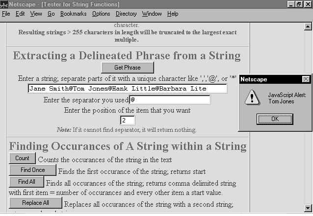 Note that this function uses an interesting trick to decide when it has come to the end of the string. It uses lastIndexOf() to get the character position of the last occurrence of the separator. As it walks the string, it checks to see if the character found equals the last instance of that character. If it does, it sets the phrase end to the end of the string, performs its usual string separation, and then quits.