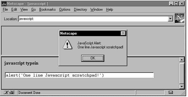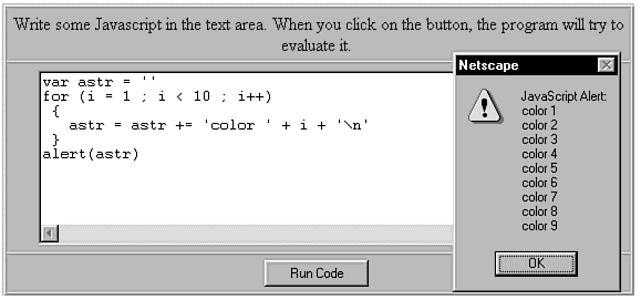 Most of the draw methods presented here accept a string terminator as a parameter, and also return a string. The terminator is usually the carriage return character, \n. This results in a string with linebreaks suitable for an alert. You can also use <BR> as the string terminator; this yields a string that can be nicely presented in a window. The utility function showInWindow in listing 9.25 pops up a window and tries to put anything you hand it into that window. We will use this function quite often in chapter 20.